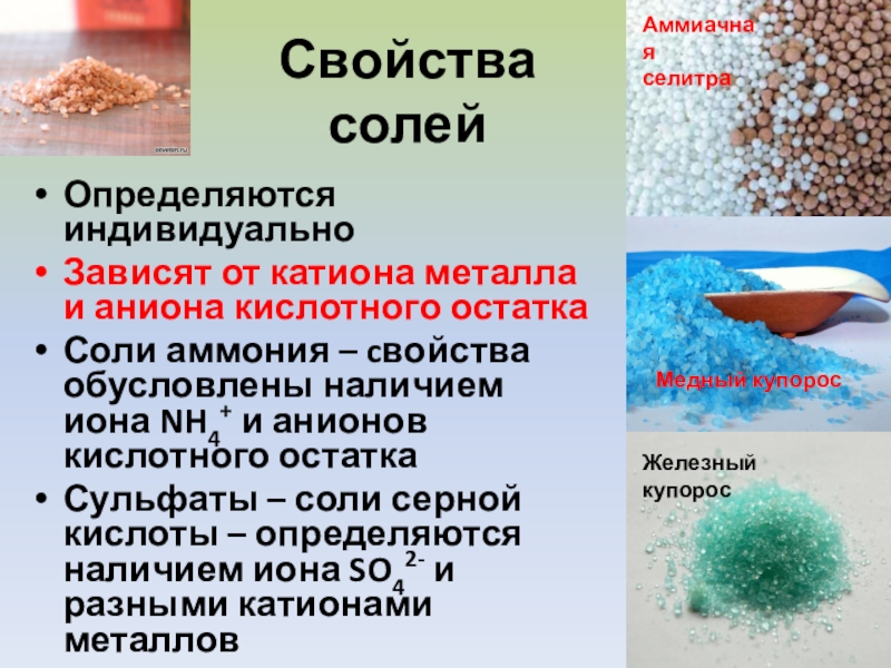 – cвойства обусловлены наличием иона NH4+ и анионов кислотного остатка