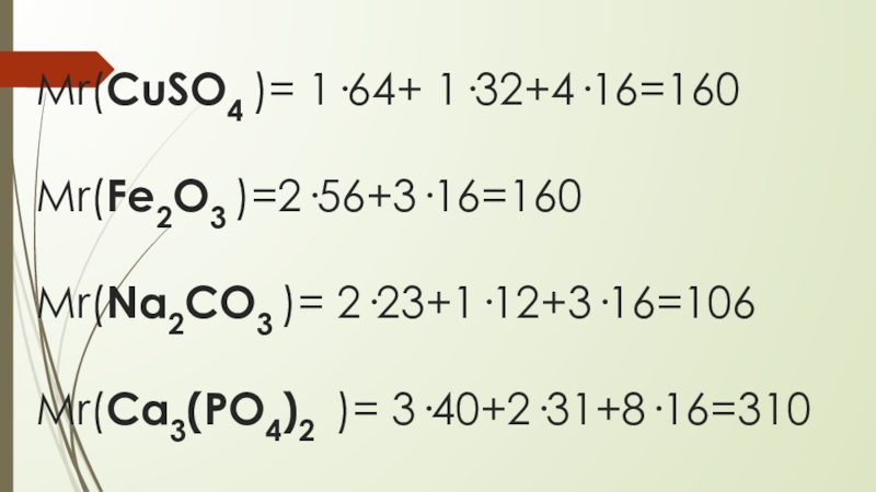 Слайд 5 Mr(CuSO4 )= 1·64+ 1·32+4·16=160 Mr(Fe2O3 )=2·56+3·16=160 Mr(Na2CO3 )= 2·23+1·12+3·16=106 Mr(Ca3(PO4)2 )= 3·40+2·31+8·16=310