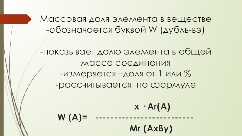 общей массе соединения -измеряется –доля от 1 или % -рассчитывается  по формуле х · Ar(A) W (A)= -------------------------- Mr (AхBу)