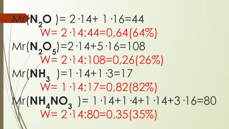 Слайд 8 Mr(N2O )= 2·14+ 1·16=44 W= 2·14:44=0,64(64%) Mr(N2O5)=2·14+5·16=108