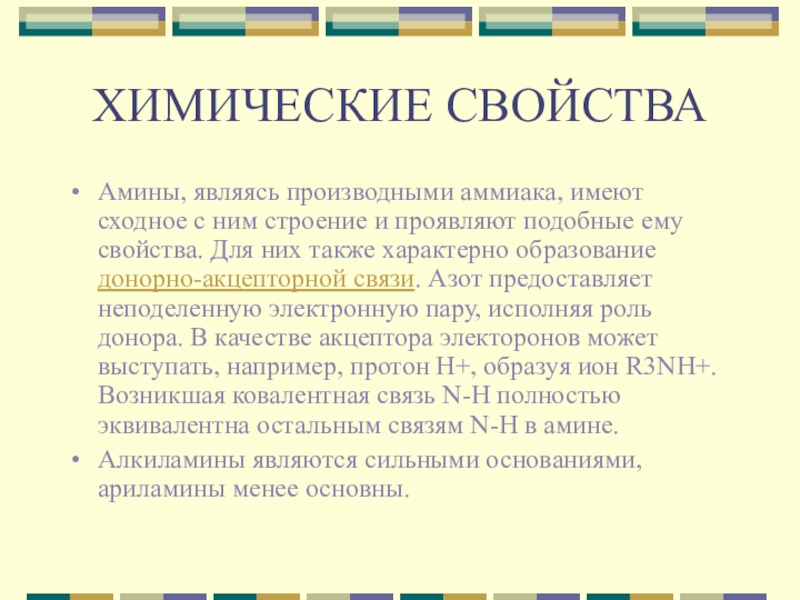 и проявляют подобные ему свойства. Для них также характерно образование донорно-акцепторной связи. Азот предоставляет неподеленную электронную пару, исполняя роль донора. В качестве акцептора электоронов может выступать, например, протон Н+, образуя ион R3NH+. Возникшая ковалентная связь N-H полностью эквивалентна остальным связям N-H в амине.