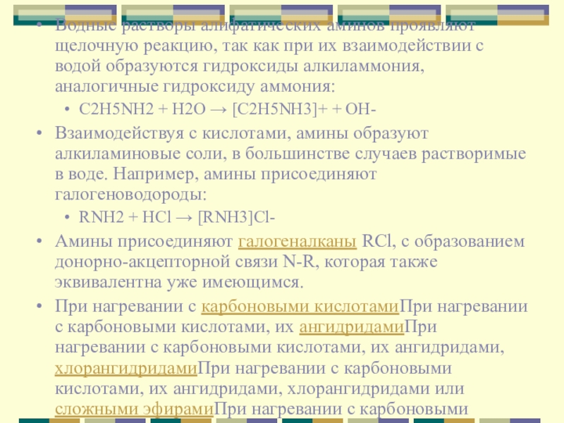 Слайд 6Водные растворы алифатических аминов проявляют щелочную реакцию, так как при их