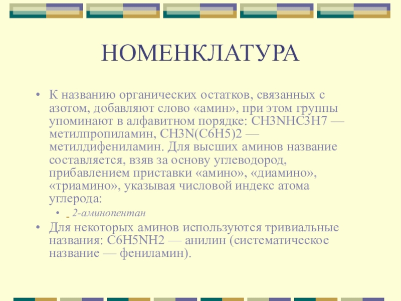 этом группы упоминают в алфавитном порядке: CH3NHC3Н7 — метилпропиламин, CH3N(С6Н5)2 — метилдифениламин. Для высших аминов название составляется, взяв за основу углеводород, прибавлением приставки «амино», «диамино», «триамино», указывая числовой индекс атома углерода: