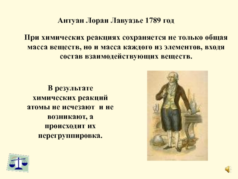 В результате химических реакций атомы не исчезают и не возникают, а происходит их перегруппировка.