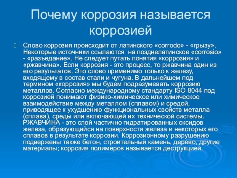 «грызу». Некоторые источники ссылаются  на позднелатинское «corrosio» - «разъедание». Не следует путать понятия «коррозия» и «ржавчина». Если коррозия - это процесс, то ржавчина один из его результатов. Это слово применимо только к железу, входящему в состав стали и чугуна. В дальнейшем под термином «коррозия» мы будем подразумевать коррозию металлов. Согласно международному стандарту ISO 8044 под коррозией понимают физико-химическое или химическое взаимодействие между металлом (сплавом) и средой, приводящее к ухудшению функциональных свойств металла (сплава), среды или включающей их технической системы.  РЖАВЧИНА - это слой частично гидратированных оксидов железа, образующийся на поверхности железа и некоторых его сплавов в результате коррозии. Коррозионному разрушению подвержены также бетон, строительный камень, дерево, другие материалы; коррозия полимеров называется деструкцией.