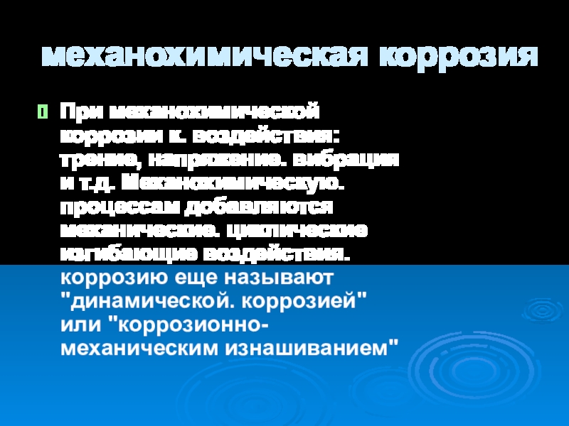 механохимическая коррозияПри механохимической коррозии к. воздействия: трение, напряжение. вибрация и т.д. Механохимическую. процессам добавляются механические. циклические изгибающие