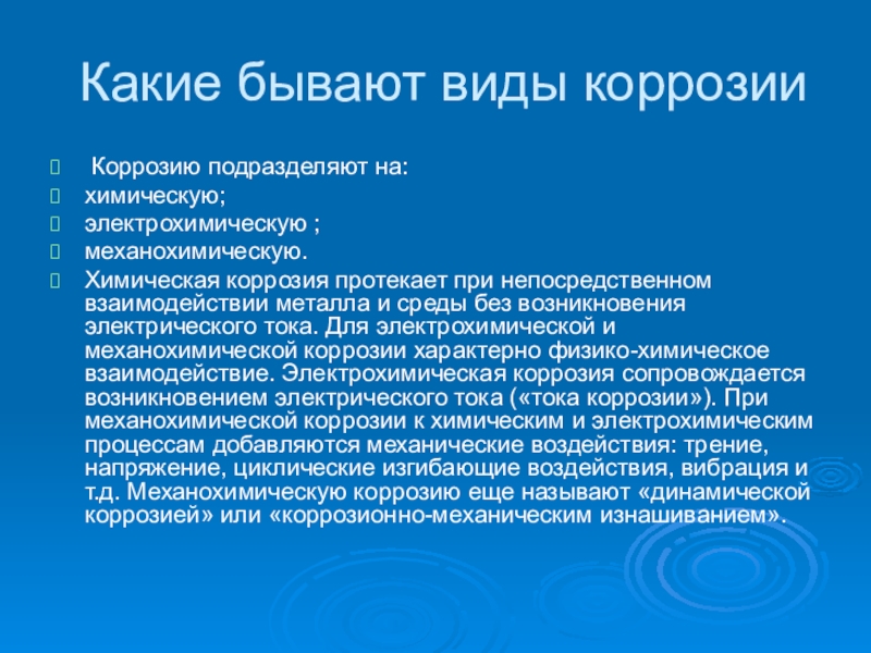 коррозия протекает при непосредственном взаимодействии металла и среды без возникновения электрического тока. Для электрохимической и механохимической коррозии характерно физико-химическое взаимодействие. Электрохимическая коррозия сопровождается возникновением электрического тока («тока коррозии»). При механохимической коррозии к химическим и электрохимическим процессам добавляются механические воздействия: трение, напряжение, циклические изгибающие воздействия, вибрация и т.д. Механохимическую коррозию еще называют «динамической коррозией» или «коррозионно-механическим изнашиванием».