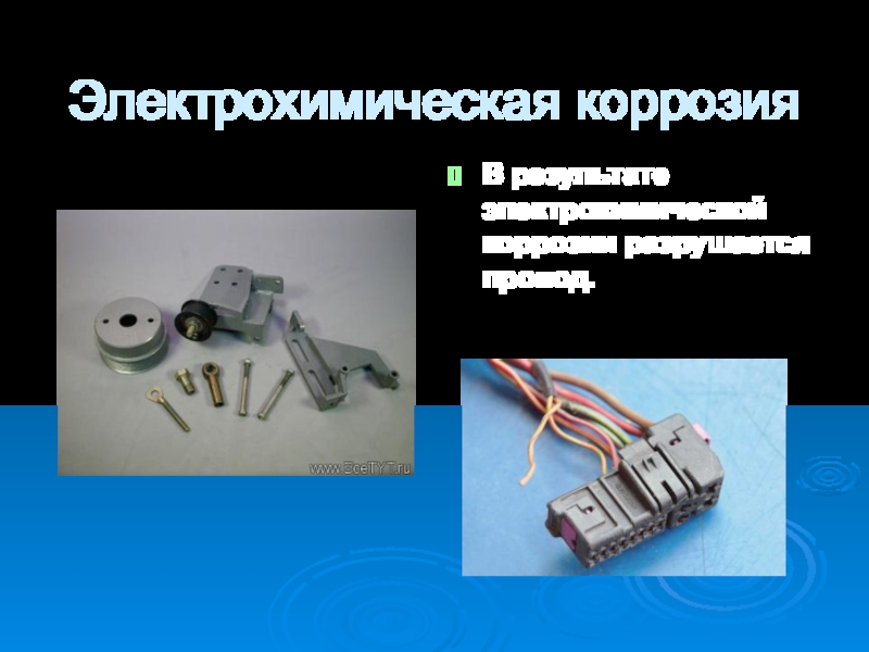 Электрохимическая коррозияВ результате электрохимической коррозии разрушается провод.