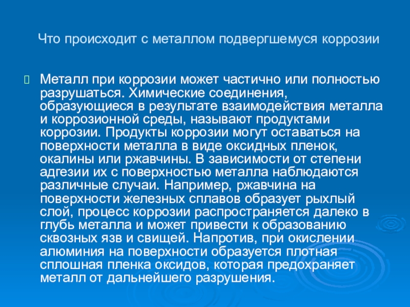 полностью разрушаться. Химические соединения, образующиеся в результате взаимодействия металла и коррозионной среды, называют продуктами коррозии. Продукты коррозии могут оставаться на поверхности металла в виде оксидных пленок, окалины или ржавчины. В зависимости от степени адгезии их с поверхностью металла наблюдаются различные случаи. Например, ржавчина на поверхности железных сплавов образует рыхлый слой, процесс коррозии распространяется далеко в глубь металла и может привести к образованию сквозных язв и свищей. Напротив, при окислении алюминия на поверхности образуется плотная сплошная пленка оксидов, которая предохраняет металл от дальнейшего разрушения.