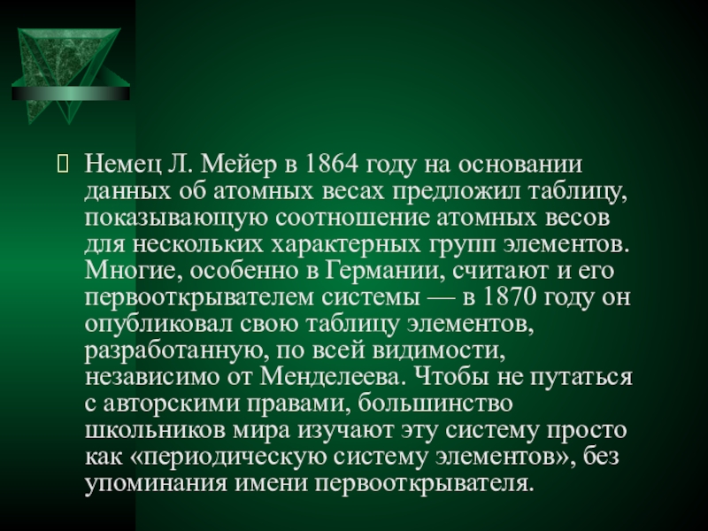 Немец Л. Мейер в 1864 году на основании данных об атомных