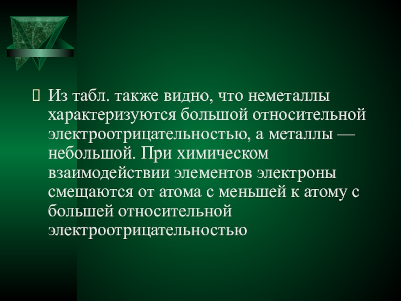 металлы — небольшой. При химическом взаимодействии элементов электроны смещаются от атома с меньшей к атому с большей относительной электроотрицательностью