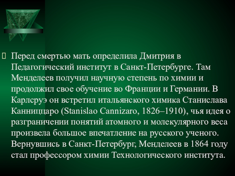Менделеев получил научную степень по химии и продолжил свое обучение во Франции и Германии. В Карлсруэ он встретил итальянского химика Станислава Канниццаро (Stanislao Cannizaro, 1826–1910), чья идея о разграничении понятий атомного и молекулярного веса произвела большое впечатление на русского ученого. Вернувшись в Санкт-Петербург, Менделеев в 1864 году стал профессором химии Технологического института.