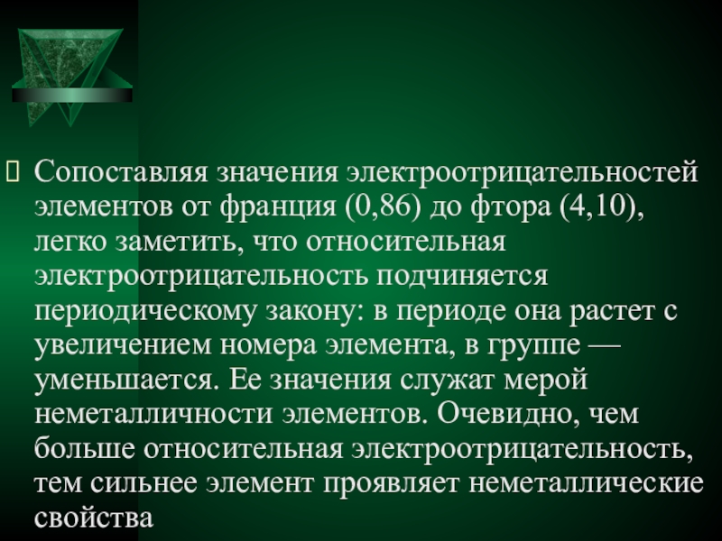 заметить, что относительная электроотрицательность подчиняется периодическому закону: в периоде она растет с увеличением номера элемента, в группе — уменьшается. Ее значения служат мерой неметалличности элементов. Очевидно, чем больше относительная электроотрицательность, тем сильнее элемент проявляет неметаллические свойства