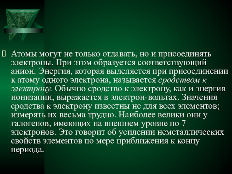образуется соответствующий анион. Энергия, которая выделяется при присоединении к атому одного электрона, называется сродством к электрону. Обычно сродство к электрону, как и энергия ионизации, выражается в электрон-вольтах. Значения сродства к электрону известны не для всех элементов; измерять их весьма трудно. Наиболее велики они у галогенов, имеющих на внешнем уровне по 7 электронов. Это говорит об усилении неметаллических свойств элементов по мере приближения к концу периода.
