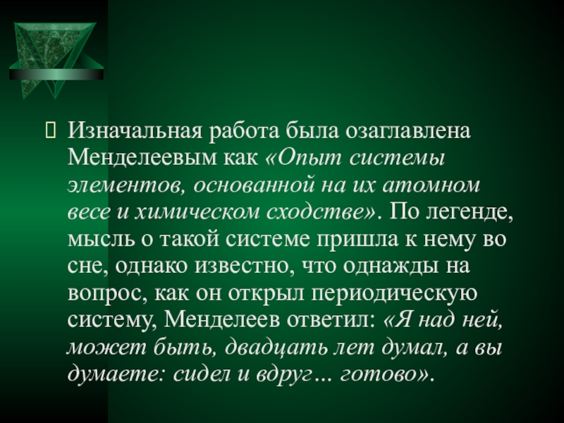 их атомном весе и химическом сходстве». По легенде, мысль о такой системе пришла к нему во сне, однако известно, что однажды на вопрос, как он открыл периодическую систему, Менделеев ответил: «Я над ней, может быть, двадцать лет думал, а вы думаете: сидел и вдруг… готово».