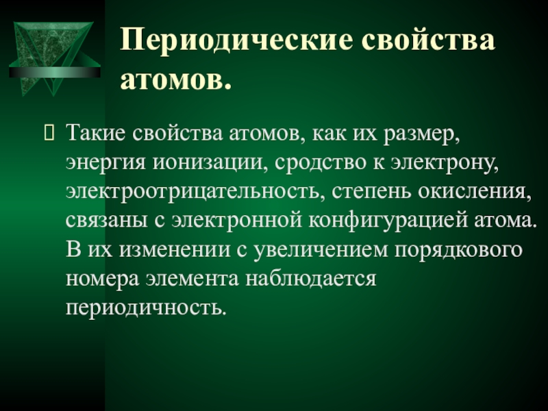 сродство к электрону, электроотрицательность, степень окисления, связаны с электронной конфигурацией атома. В их изменении с увеличением порядкового номера элемента наблюдается периодичность.