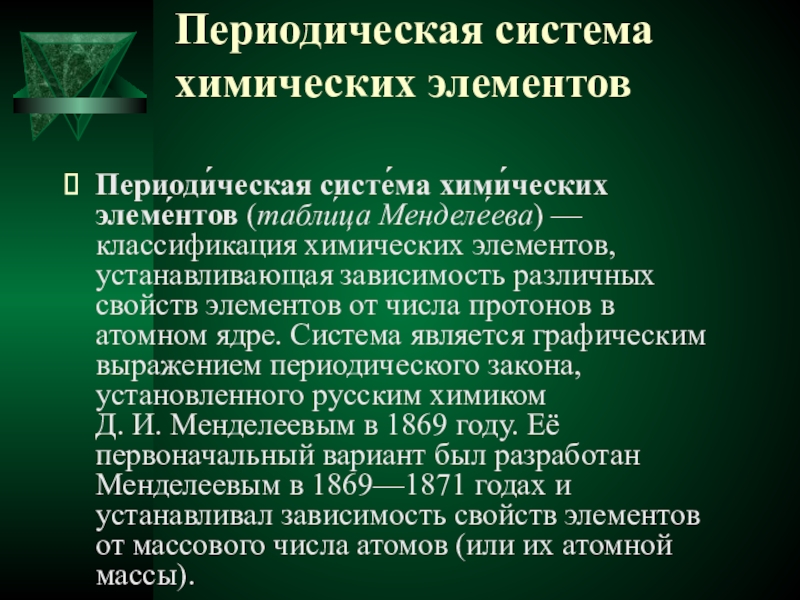 элементов, устанавливающая зависимость различных свойств элементов от числа протонов в атомном ядре. Система является графическим выражением периодического закона, установленного русским химиком Д. И. Менделеевым в 1869 году. Её первоначальный вариант был разработан Менделеевым в 1869—1871 годах и устанавливал зависимость свойств элементов от массового числа атомов (или их атомной массы).
