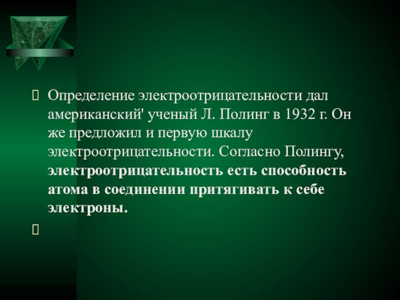 Определение электроотрицательности дал американский' ученый Л. Полинг в 1932 г. Он