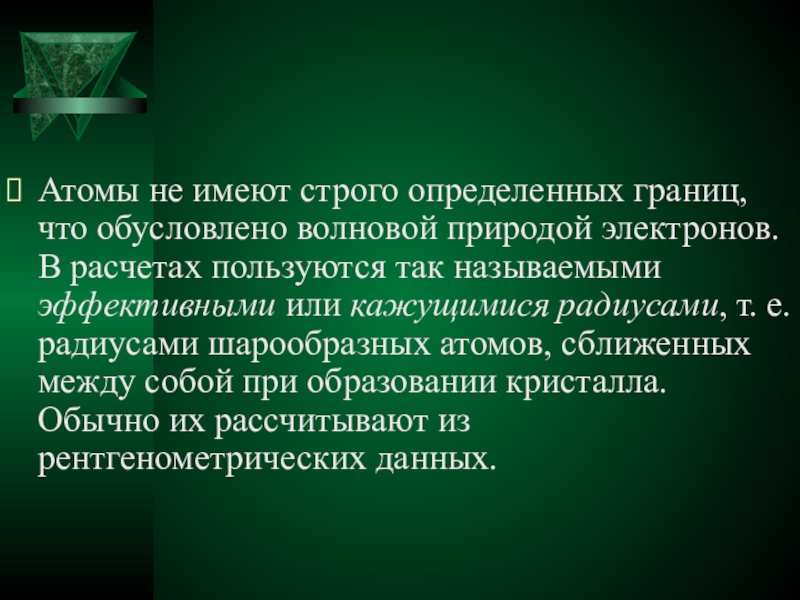 В расчетах пользуются так называемыми эффективными или кажущимися радиусами, т. е. радиусами шарообразных атомов, сближенных между собой при образовании кристалла. Обычно их рассчитывают из рентгенометрических данных.