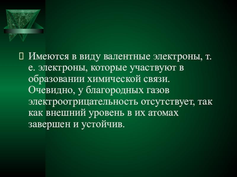 образовании химической связи. Очевидно, у благородных газов электроотрицательность отсутствует, так как внешний уровень в их атомах завершен и устойчив.