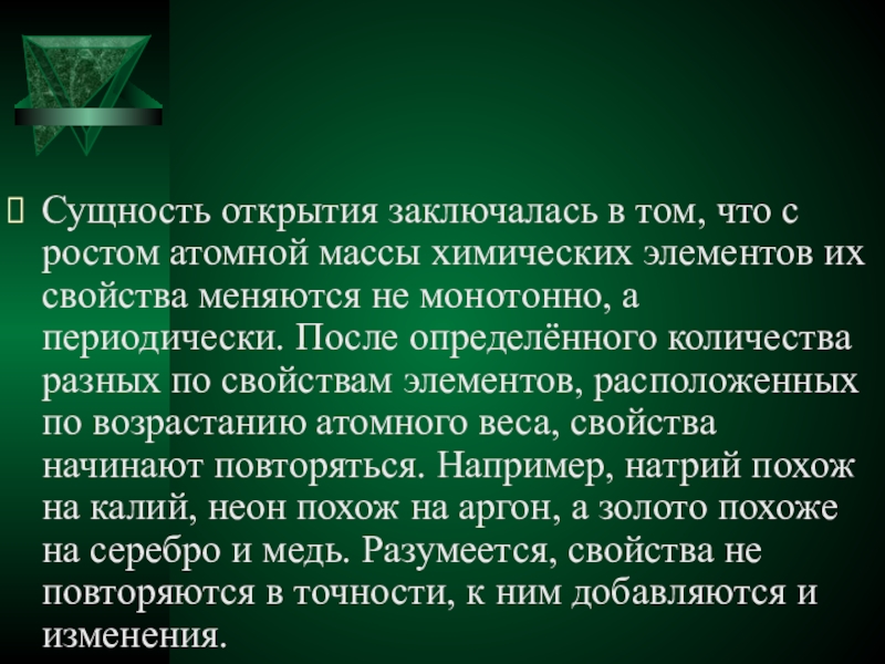 Слайд 23Сущность открытия заключалась в том, что с ростом атомной массы химических