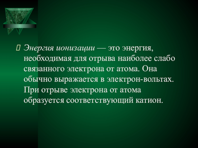 Энергия ионизации — это энергия, необходимая для отрыва наиболее слабо связанного