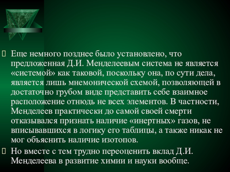 является «системой» как таковой, поскольку она, по сути дела, является лишь мнемонической схемой, позволяющей в достаточно грубом виде представить себе взаимное расположение отнюдь не всех элементов. В частности, Менделеев практически до самой своей смерти отказывался признать наличие «инертных» газов, не вписывавшихся в логику его таблицы, а также никак не мог объяснить наличие изотопов.