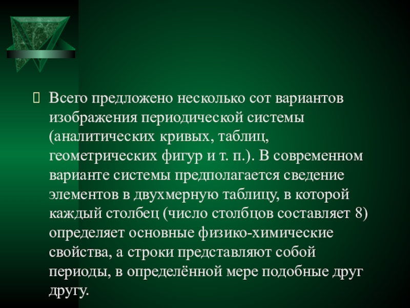 Всего предложено несколько сот вариантов изображения периодической системы (аналитических кривых, таблиц,