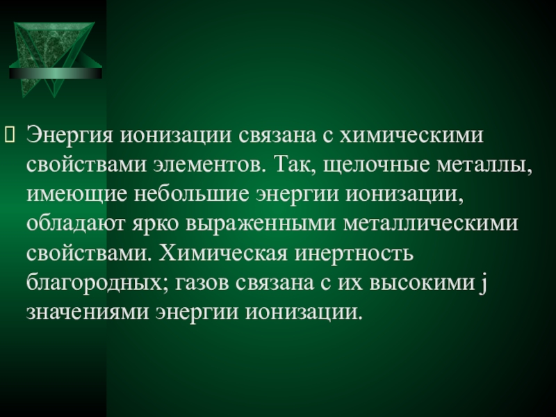Энергия ионизации связана с химическими свойствами элементов. Так, щелочные металлы, имеющие