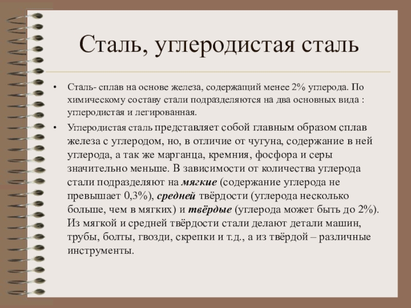 Углеродистая сталь представляет собой главным образом сплав железа с углеродом, но, в отличие от чугуна, содержание в ней углерода, а так же марганца, кремния, фосфора и серы значительно меньше. В зависимости от количества углерода стали подразделяют на мягкие (содержание углерода не превышает 0,3%), средней твёрдости (углерода несколько больше, чем в мягких) и твёрдые (углерода может быть до 2%). Из мягкой и средней твёрдости стали делают детали машин, трубы, болты, гвозди, скрепки и т.д., а из твёрдой – различные инструменты.