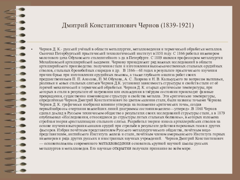 металловедения и термической обработки металлов. Окончил Петербургский практический технологический институт в1858 году. С 1866 работал инженером молотового цеха Обуховского сталелитейного з-да в Петербурге. С 1889 являлся профессором металлургии Михайловской артиллерийской академии. Чернову принадлежит ряд важных исследований в области артиллерийского производства: получения стали и изготовления высококачественных стальных орудийных стволов, стальных бронебойных снарядов и др. В 1866—68 годах в результате практического изучения причин брака при изготовлении орудийных поковок, а также глубокого анализа работ своих предшественников П. П. Аносова, П. М.Обухова, А. С. Лаврова и Н. В. Калакуцкого по вопросам выплавки, разливки и ковки стальных слитков Чернов Д.К. установил зависимость структуры и свойств стали от её горячей механической и термической обработки. Чернов Д. К. открыл критические температуры, при которых в стали в результате её нагревания или охлаждения в твёрдом состоянии происходят фазовые превращения, существенно изменяющие структуру и свойства металла. Эти критические температуры, определённые Чернов Дмитрий Константинович по цветам каления стали, были названы точками Чернова Чернов Д. К. графически изобразил влияние углерода на положение критических точек, создав первыйнабросок очертания важнейших линий диаграммы состояния«железо—углерод» .В 1868 Чернов сделал доклад в Русском техническом обществе о результатах своих исследований структуры стали, а в 1879 опубликовал «Исследования, относящиеся до структуры литых стальных болванок», в которых изложена стройная теория кристаллизации стального слитка. Разработал теорию износа артиллерийских стволов на основе изучения выгорания каналов орудий при стрельбе в результате действия пороховых газов и других факторов. Избран почётным представителем Русского металлургического общества, почётным вице-представителем, английского Института железа и стали, почётным членом американского Института горных инженеров и ряда других русских и иностранных научных учреждений. Чернов Дмитрий Константинович — основоположник современного металловедения основатель крупной научной школы русских металлургов и металловедов. Его научные открытия получили признание во всём мире.