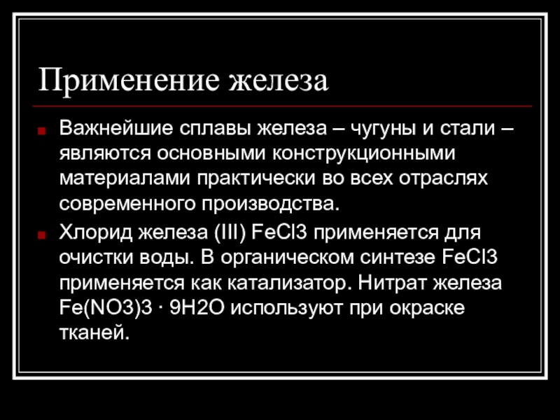 Хлорид железа (III) FeCl3 применяется для очистки воды. В органическом синтезе FeCl3 применяется как катализатор. Нитрат железа Fe(NO3)3 ∙ 9H2O используют при окраске тканей.