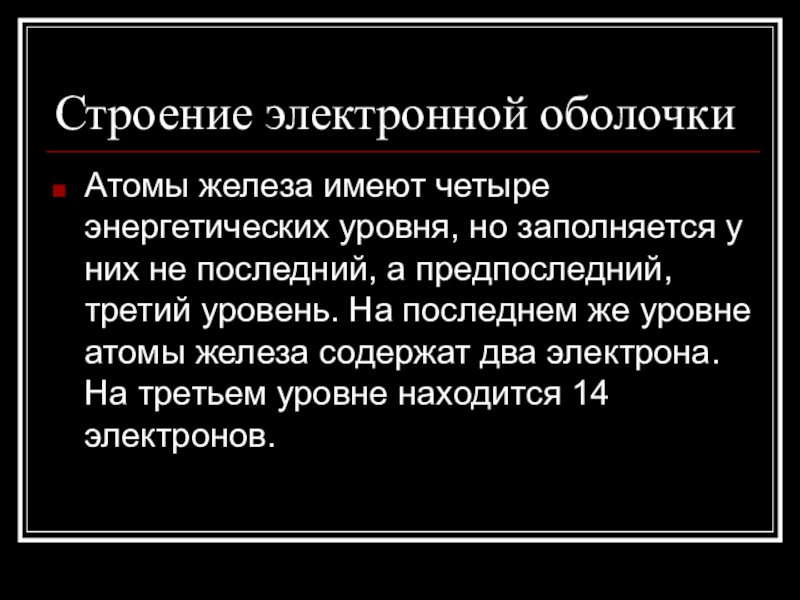 них не последний, а предпоследний, третий уровень. На последнем же уровне атомы железа содержат два электрона. На третьем уровне находится 14 электронов.