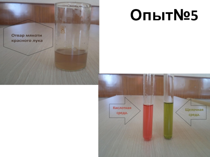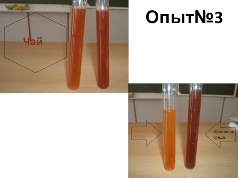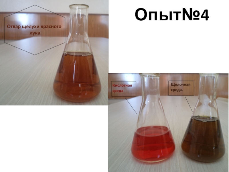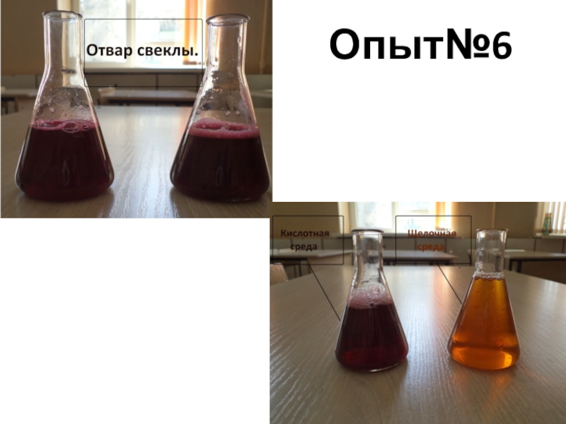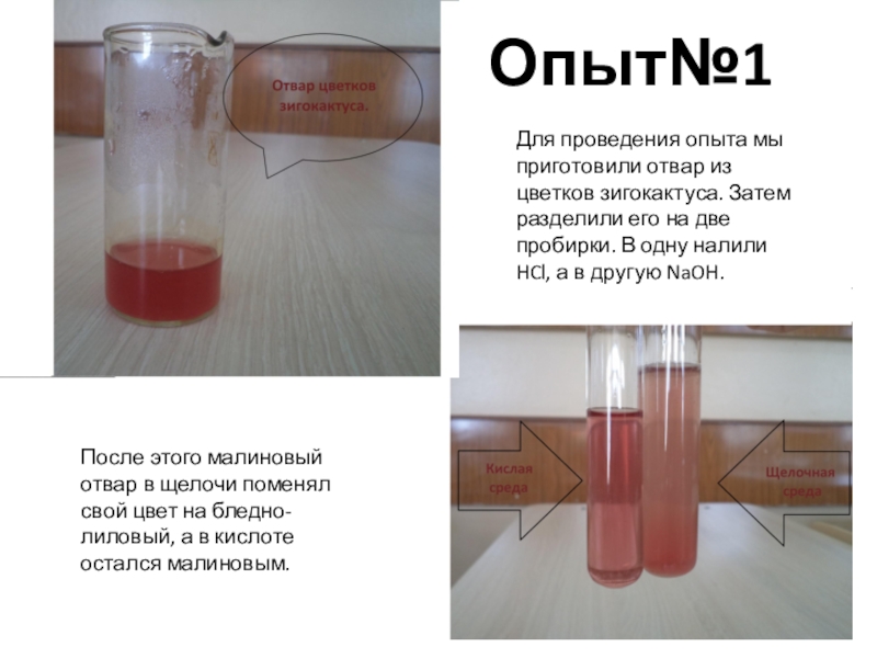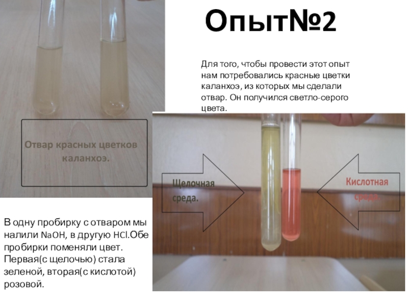 В одну пробирку с отваром мы налили NaOH, в другую HCl.Обе пробирки поменяли цвет. Первая(с щелочью) стала зеленой, вторая(с кислотой) розовой.