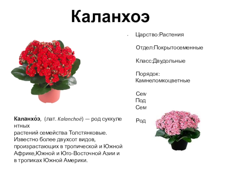 Каланхо́э, (лат. Kalanchoë) — род суккулентных растений семейства Толстянковые. Известно более двухсот видов, произрастающих в тропической и Южной Африке,Южной и Юго-Восточной Азии и в тропиках Южной Америки.