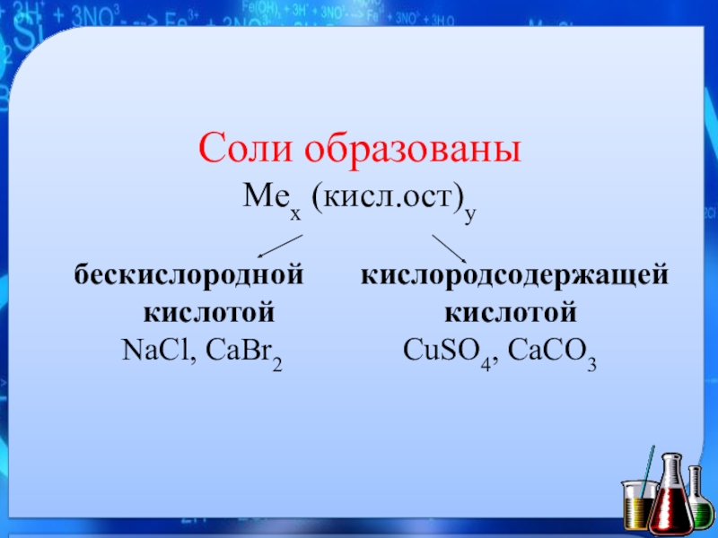 Слайд 9Соли – сложные вещества, состоящие из ионов металлов и кислотных остатков.