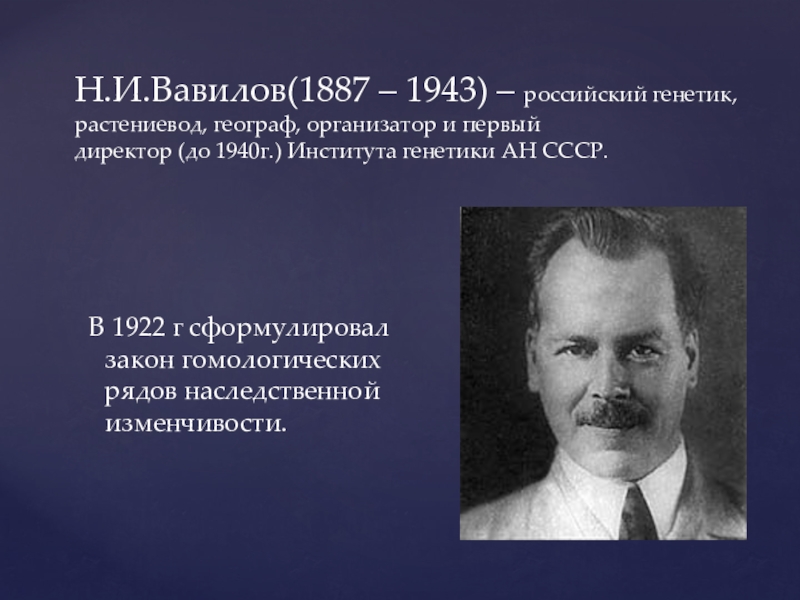 В 1922 г сформулировал закон гомологических рядов наследственной изменчивости.