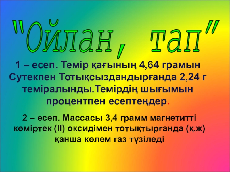 2 – есеп. Массасы 3,4 грамм магнетитті көміртек (ІІ) оксидімен тотықтырғанда (қ.ж) қанша көлем газ түзіледі