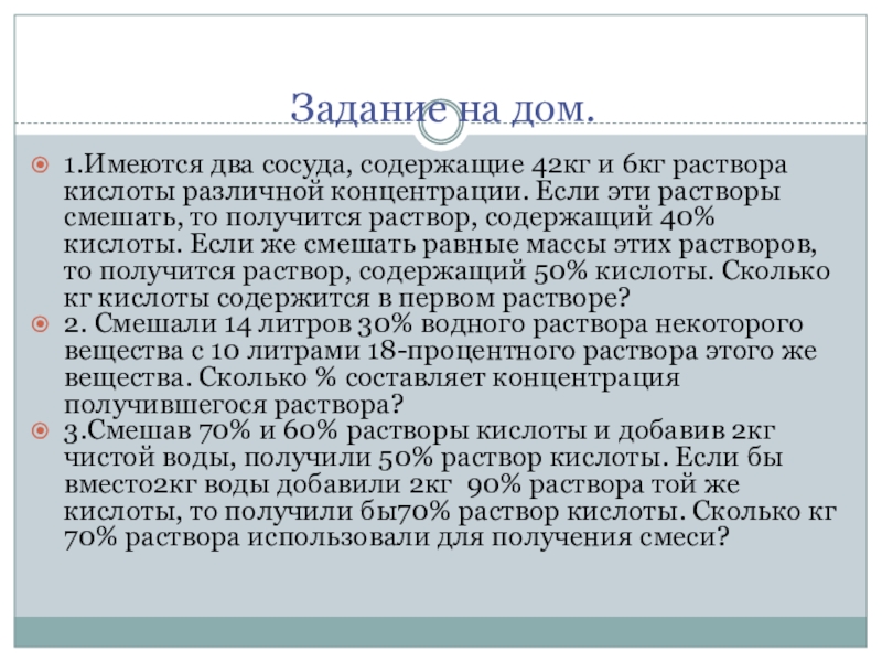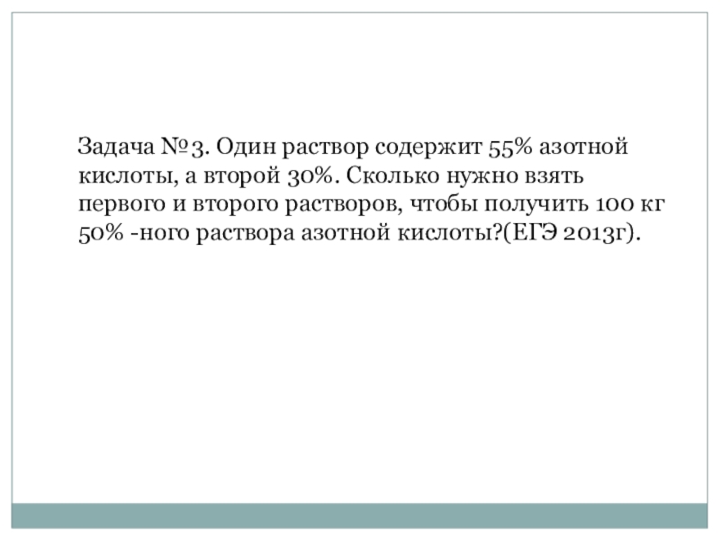 различной концентрации. Если эти растворы смешать, то получится раствор, содержащий 40% кислоты. Если же смешать равные массы этих растворов, то получится раствор, содержащий 50% кислоты. Сколько кг кислоты содержится в первом растворе?