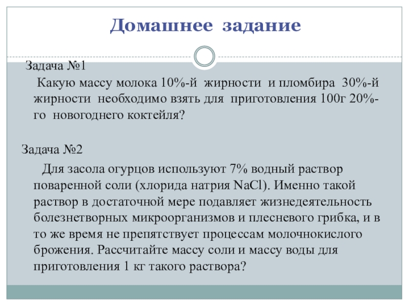 Для засола огурцов используют 7% водный раствор поваренной соли (хлорида натрия NaCl). Именно такой раствор в достаточной мере подавляет жизнедеятельность болезнетворных микроорганизмов и плесневого грибка, и в то же время не препятствует процессам молочнокислого брожения. Рассчитайте массу соли и массу воды для приготовления 1 кг такого раствора?
