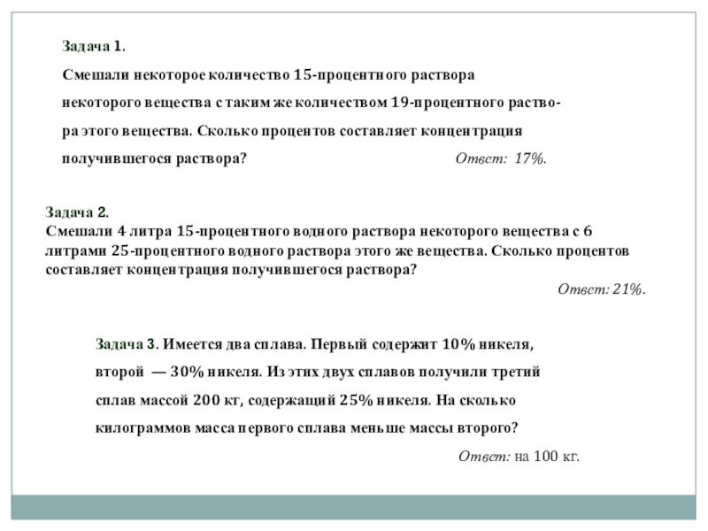 3.Смешав 70% и 60% растворы кислоты и добавив 2кг чистой воды, получили 50% раствор кислоты. Если бы вместо2кг воды добавили 2кг 90% раствора той же кислоты, то получили бы70% раствор кислоты. Сколько кг 70% раствора использовали для получения смеси?
