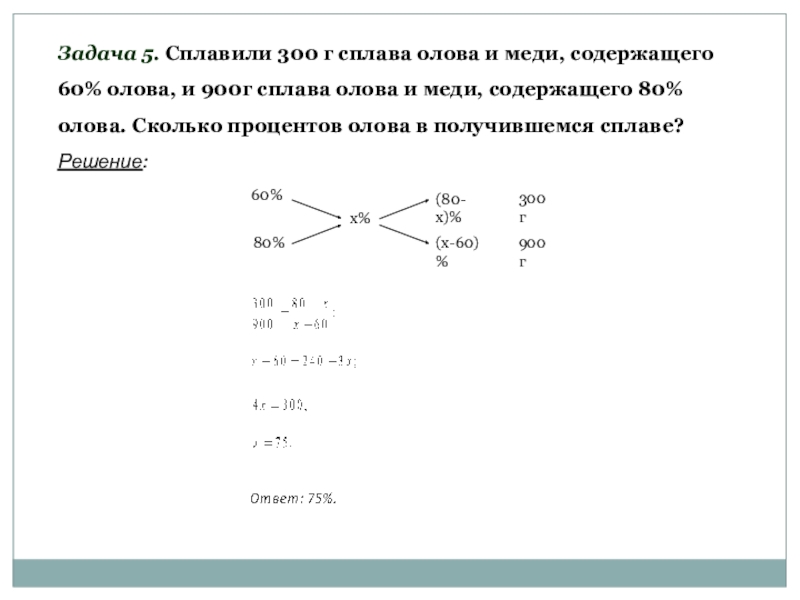 Слайд 38Задача 5. Сплавили 300 г сплава олова и меди, содержащего 60%