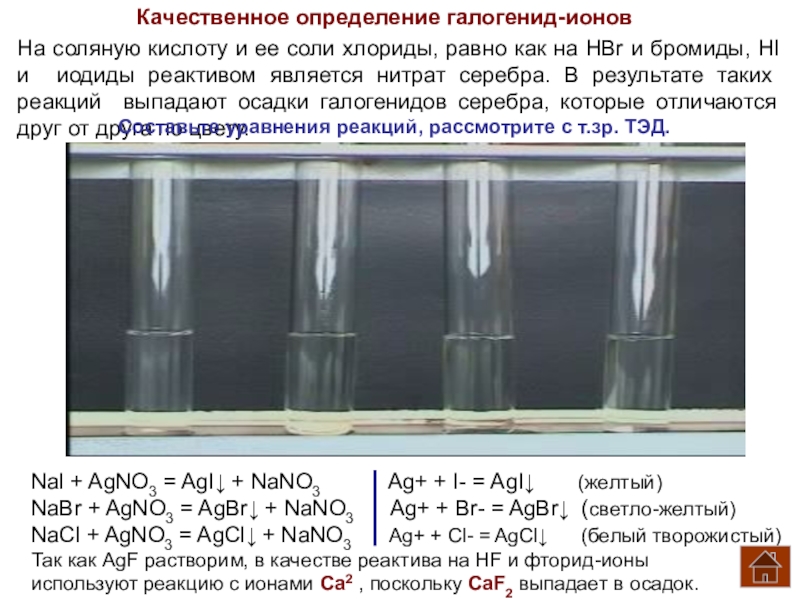 Nal + AgNO3 = AgI↓ + NaNO3 Ag+ + I- = AgI↓ (желтый)