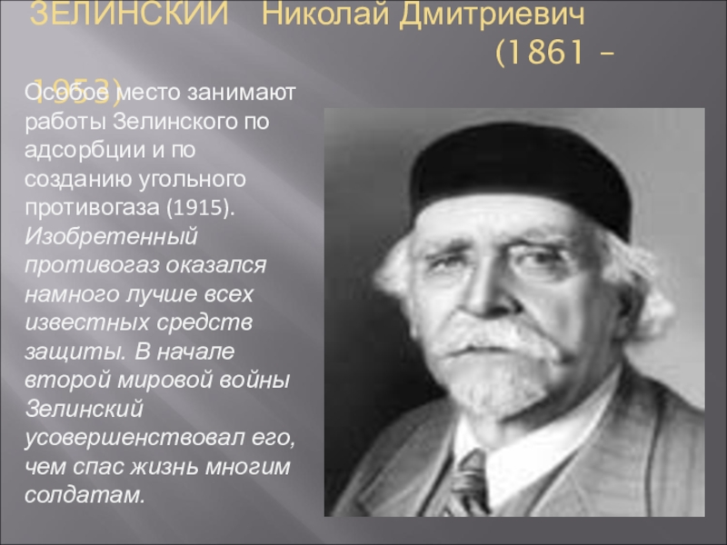 Особое место занимают работы Зелинского по адсорбции и по созданию угольного противогаза (1915). Изобретенный противогаз оказался намного лучше всех известных средств защиты. В начале второй мировой войны Зелинский усовершенствовал его, чем спас жизнь многим солдатам.