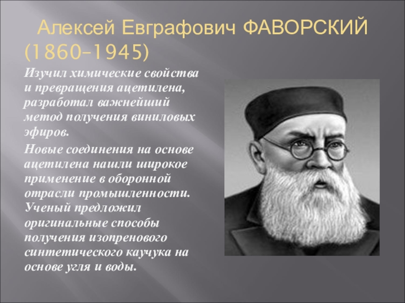 Новые соединения на основе ацетилена нашли широкое применение в оборонной отрасли промышленности. Ученый предложил оригинальные способы получения изопренового синтетического каучука на основе угля и воды.