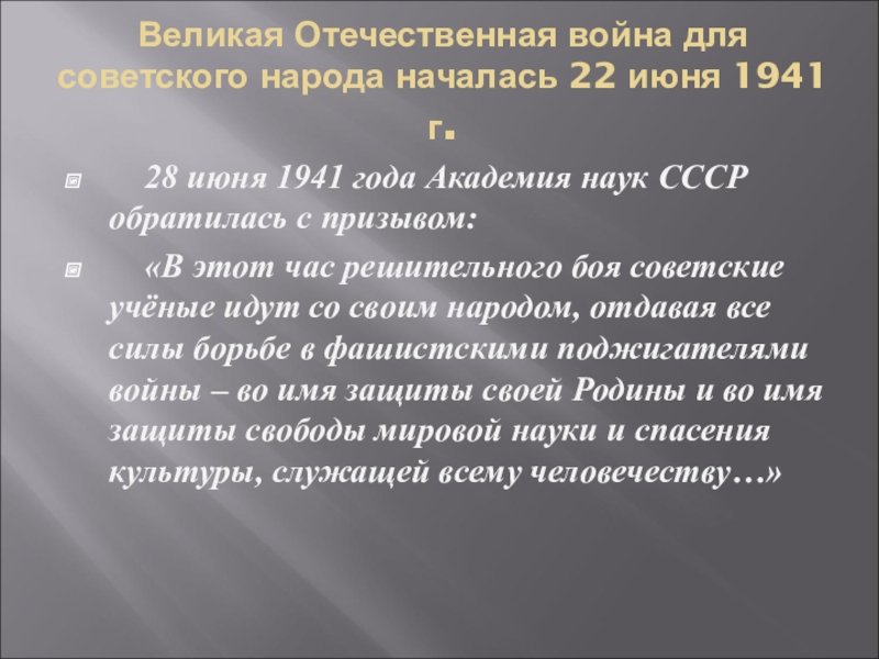 «В этот час решительного боя советские учёные идут со своим народом, отдавая все силы борьбе в фашистскими поджигателями войны – во имя защиты своей Родины и во имя защиты свободы мировой науки и спасения культуры, служащей всему человечеству…»