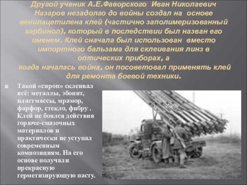 Такой «сироп» склеивал всё: металлы, эбонит, пластмассы, мрамор, фарфор, стекло, фибру . Клей не боялся действия горюче-смазочных материалов и практически не уступал современным композициям. На его основе получали прекрасную герметизирующую пасту.