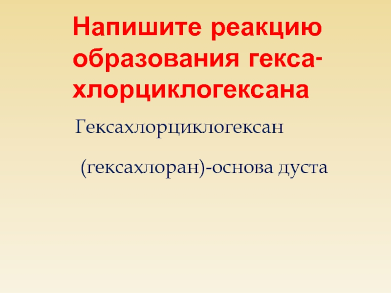 Слайд 20Напишите реакцию образования гекса- хлорциклогексана