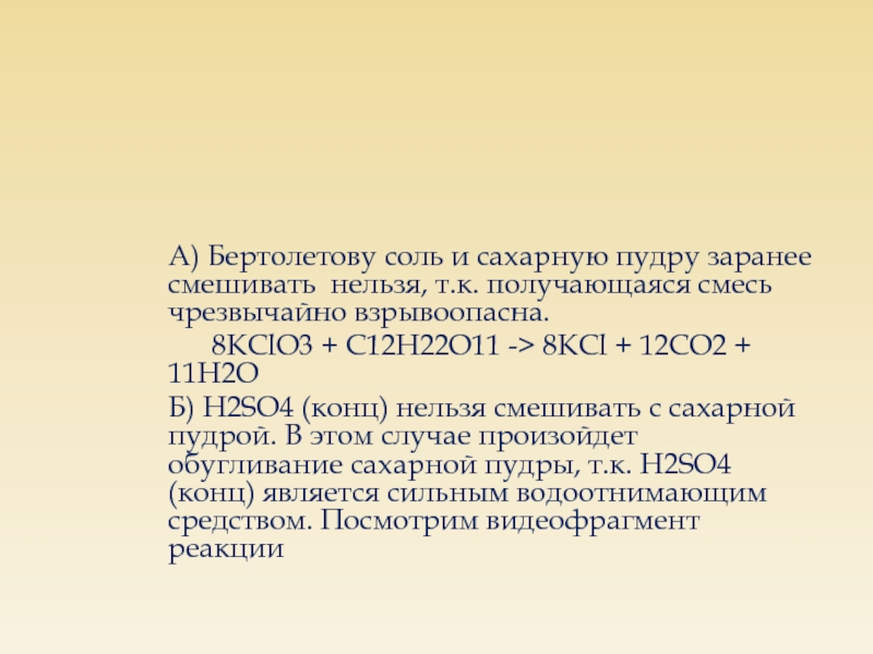 Слайд 32А) Бертолетову соль и сахарную пудру заранее смешивать нельзя, т.к. получающаяся