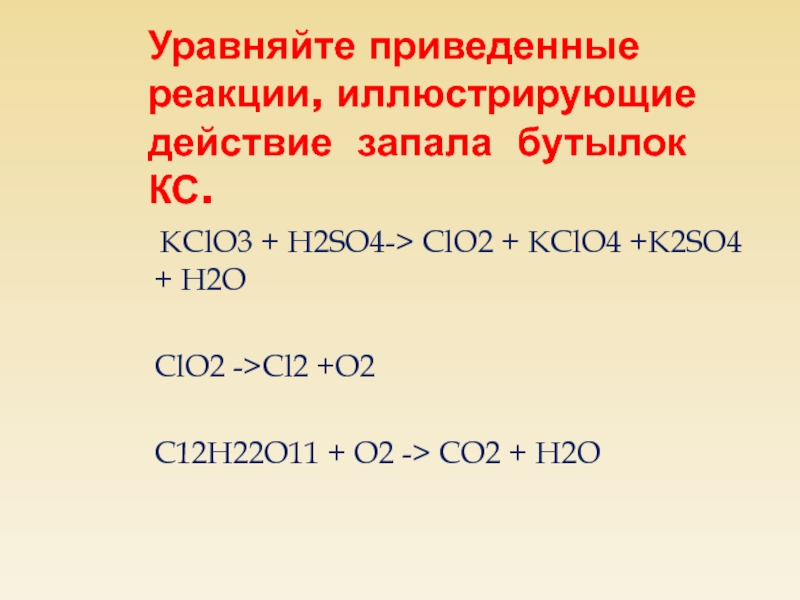 Слайд 30Уравняйте приведенные реакции, иллюстрирующие действие запала бутылок КС.